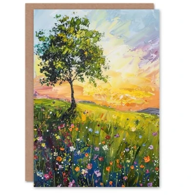 Artery8 Tree Wildflower Meadow at Sunrise Oil Painting Greeting Birthday Card Him Her All Blank
