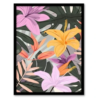 Artery8 Tropical Exotic Colourful Lilies Monstera Design Living Room Artwork Framed Wall Art Print A4