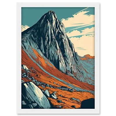 Artery8 Tryfan Mountain Peak Landscape Teal Brown Linocut Artwork Framed A3 Wall Art Print