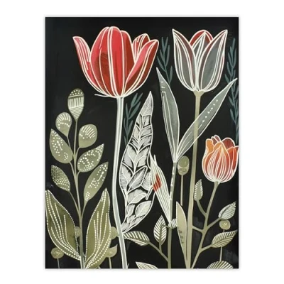 Artery8 Tulip Flower Field Red Green Grey Folk Art Floral Living Room Extra Large XL Wall Poster Print