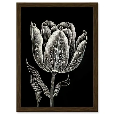 Artery8 Tulip Flower White on Black Blind Contour Folk Art Artwork Framed A3 Wall Print