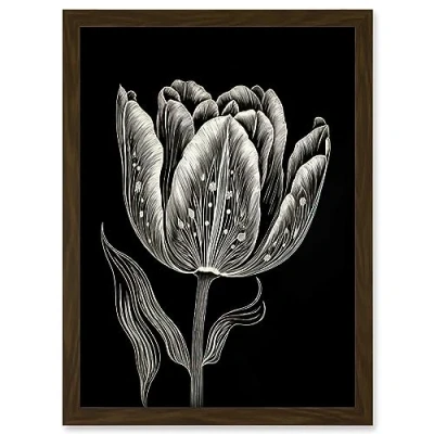 Artery8 Tulip Flower White on Black Blind Contour Folk Art Artwork Framed Wall Print A4