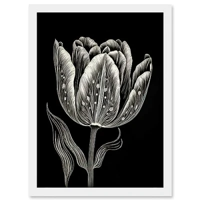 Artery8 Tulip Flower White on Black Blind Contour Folk Art Artwork Framed Wall Print A4