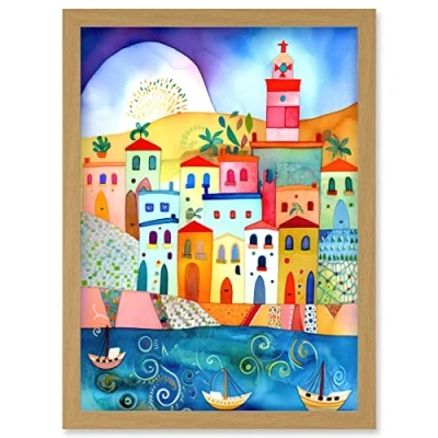 Artery8 Tunisia Seaside Town Folk Art Artwork Framed Wall Print A4