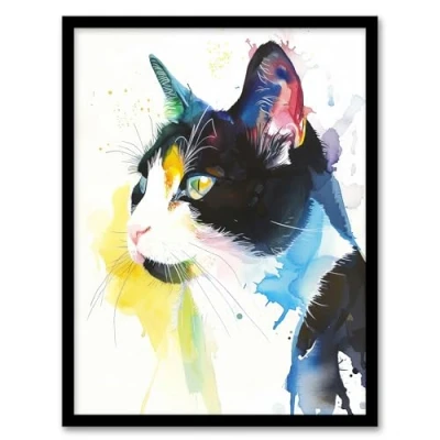 Artery8 Tuxedo Black White Cat Lover Bright Watercolour Living Room Artwork Framed Wall Art Print A4