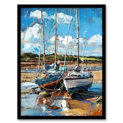 Artery8 Two Sailboats on Alnmouth Beach Painting Coastal Living Room Artwork Framed Wall Art Print A4