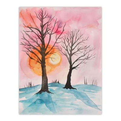 Artery8 Two Trees Misty Sunset Winter Snow Landscape Living Room Large Wall Art Poster Print Thick Paper 18X24 Inch