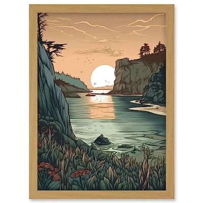 Artery8 Untouched Nature Coastal Cliff Sunset Landscape Artwork Framed Wall Art Print A4