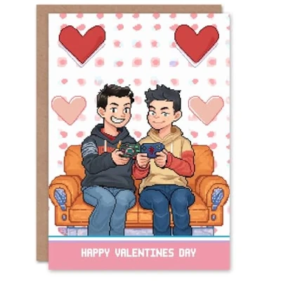 Artery8 Valentines Day Greeting Card Gay Gamers Video Games Pixel Art For Him Husband Partner