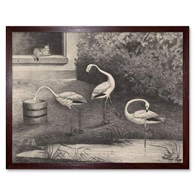 Artery8 Van Der Beek Three Flamingos Window Cat Drawing Art Print Framed Poster Wall Decor 12x16 inch