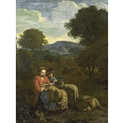 Artery8 Van Der Does Shepherdess Reading Child Sheep Art Print Canvas Premium Wall Decor Poster Mural