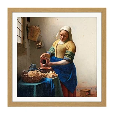Artery8 Vermeer The Milkmaid Woman Kitchen Painting Square Wooden Framed Wall Art Print Picture 16X16 Inch