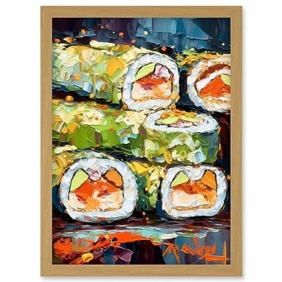 Artery8 Vibrant Japanese Cuisine Sushi Roll Oil Painting Artwork Framed Wall Art Print A4