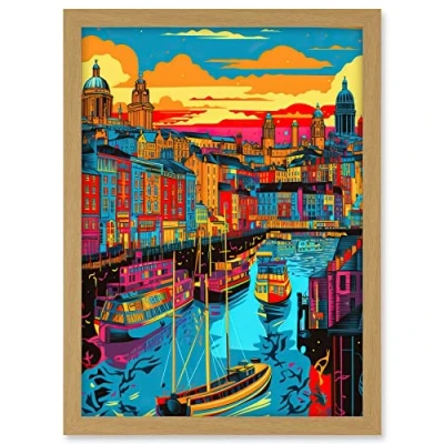 Artery8 Vibrant Liverpool City Waterfront Sunset Cityscape Artwork Framed A3 Wall Art Print