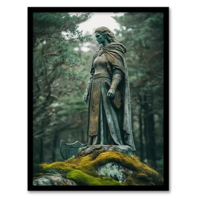 Artery8 Viking Shield Maiden Warrior Statue in Forest Living Room Artwork Framed Wall Art Print A4