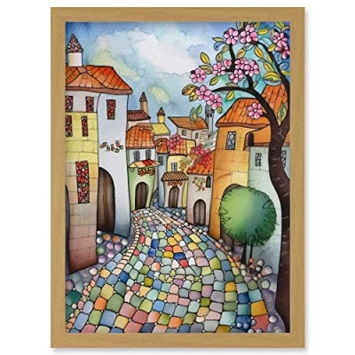 Artery8 Village Cobbled Street Cherry Blossom Folk Art Artwork Framed Wall Print A4