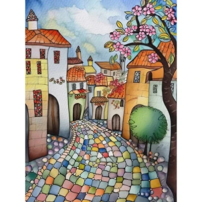 Artery8 Village Cobbled Street Cherry Blossom Folk Art Large Wall Poster Print Thick Paper 18X24 Inch