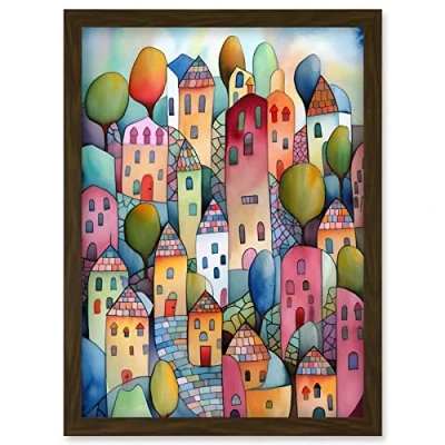 Artery8 Village On The Hill Cobble Streets Folk Art Artwork Framed Wall Print A4
