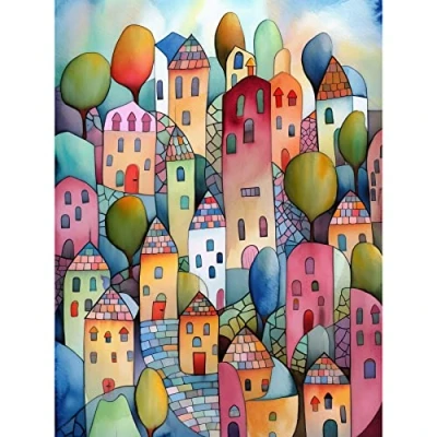 Artery8 Village On The Hill Cobble Streets Folk Art Large Wall Poster Print Thick Paper 18X24 Inch