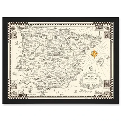 Artery8 Vintage Map Ernest Dudley Chase 1935 Spain Portugal Pictorial Artwork Framed Wall Art Print A4