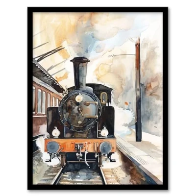 Artery8 Vintage Travel Steam Train Front View Watercolour Living Room Artwork Framed Wall Art Print A4