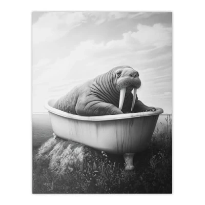 Artery8 Walrus in Bathtub Black White Coastal Surreal Bathroom Toilet Large Wall Art Poster Print Thick Paper 18X24 Inch