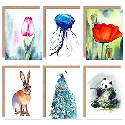 Artery8 Watercolour Nature Animals Flowers All Occasions Various Assorted Blank Greeting Cards With Envelopes Pack of 6