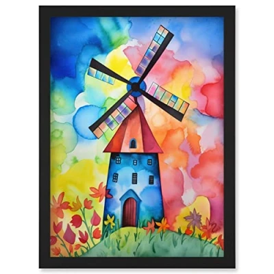 Artery8 Watercolour Windmill Netherlands Folk Art Artwork Framed Wall Print A4