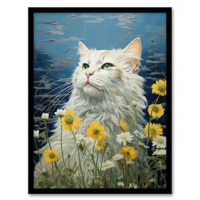 Artery8 White Cat In The Wildflowers Floral Meadow Oil Painting Norwegian Forest Artwork Framed Wall Art Print A4