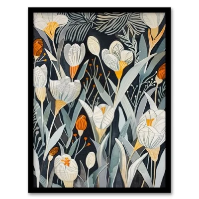 Artery8 White Crocus Flower Garden Artwork Dark Floral Living Room Framed Wall Art Print A4
