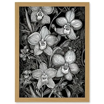 Artery8 White on Black Blooming Orchid Flower Plants Artwork Framed A3 Wall Art Print
