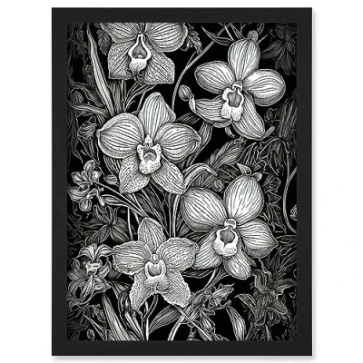 Artery8 White on Black Blooming Orchid Flower Plants Artwork Framed Wall Art Print A4