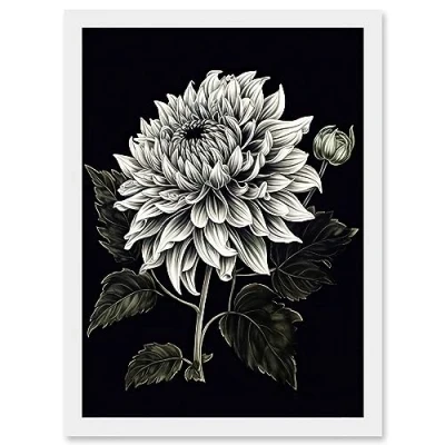 Artery8 White on Black Dahlia Flower Bloom Illustration Artwork Framed Wall Art Print A4