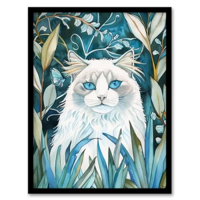 Artery8 White Ragdoll Cat Lover Pet in Garden at Night Living Room Artwork Framed Wall Art Print A4