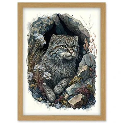 Artery8 Wild Cat in Rock Cavity with Wildflowers Detailed Watercolour Illustration Artwork Framed Wall Art Print A4