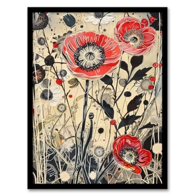 Artery8 Wildflower Field Spring Poppy Flowers Painting Living Room Artwork Framed Wall Art Print A4