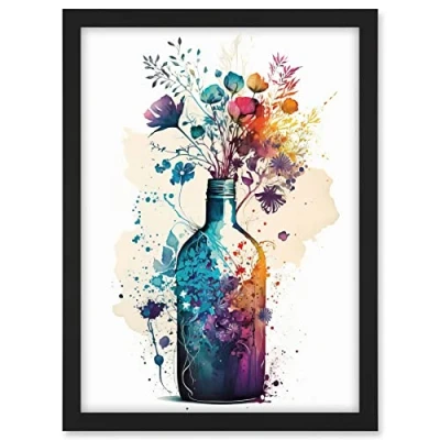Artery8 Wildflower Spring Bouquet in Glass Wine Bottle Artwork Framed A3 Wall Art Print