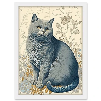 Artery8 William Morris Inspired Cat Portrait with Flowers Modern Illustration Artwork Framed A3 Wall Art Print