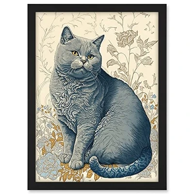 Artery8 William Morris Inspired Cat Portrait with Flowers Modern Illustration Artwork Framed A3 Wall Art Print