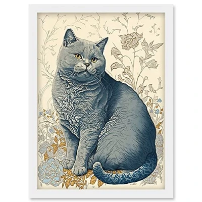 Artery8 William Morris Inspired Cat Portrait with Flowers Modern Illustration Artwork Framed Wall Art Print A4