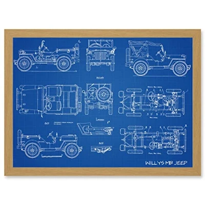 Artery8 Willys MB US Army Military Jeep Vehicle Blueprint Plan Artwork Framed Wall Art Print A4