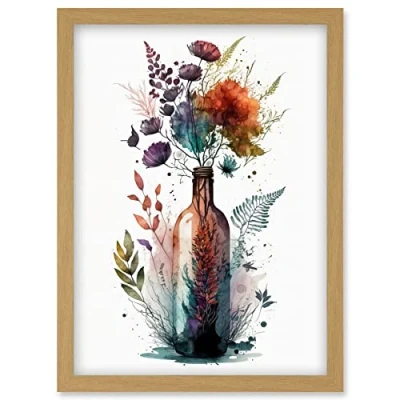 Artery8 Wine Bottle with Spring Wildflower Floral Bouquet Artwork Framed Wall Art Print A4