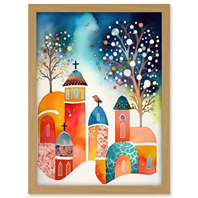 Artery8 Winter Churchyard Snowfall Trees Folk Art Artwork Framed A3 Wall Print