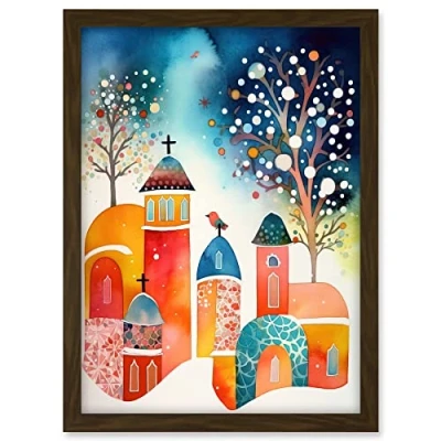 Artery8 Winter Churchyard Snowfall Trees Folk Art Artwork Framed A3 Wall Print