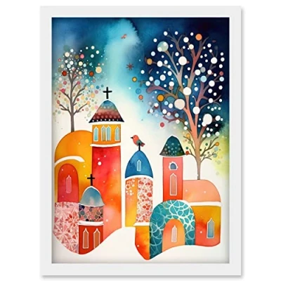 Artery8 Winter Churchyard Snowfall Trees Folk Art Artwork Framed Wall Print A4