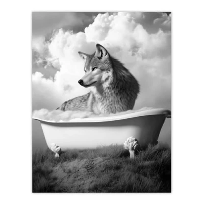 Artery8 Wolf in Bathtub Surreal Black White Bubble Bath Bathroom Toilet Extra Large XL Wall Art Poster Print