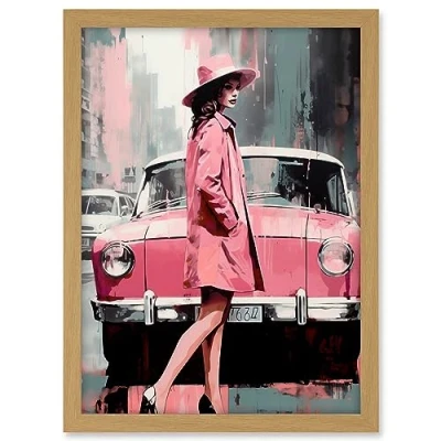 Artery8 Woman and Classic Car Retro Pink Aesthetic Artwork Framed A3 Wall Art Print