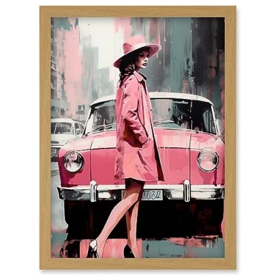 Artery8 Woman and Classic Car Retro Pink Aesthetic Artwork Framed Wall Art Print A4
