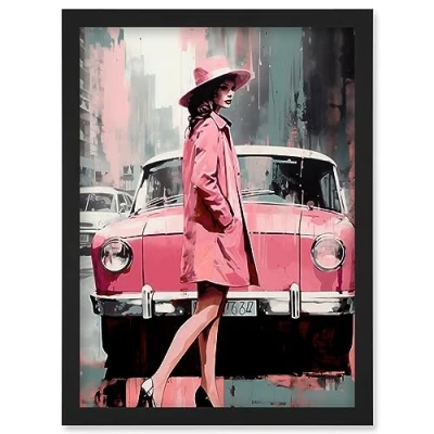Artery8 Woman and Classic Car Retro Pink Aesthetic Artwork Framed Wall Art Print A4