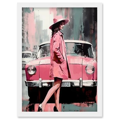 Artery8 Woman and Classic Car Retro Pink Aesthetic Artwork Framed Wall Art Print A4